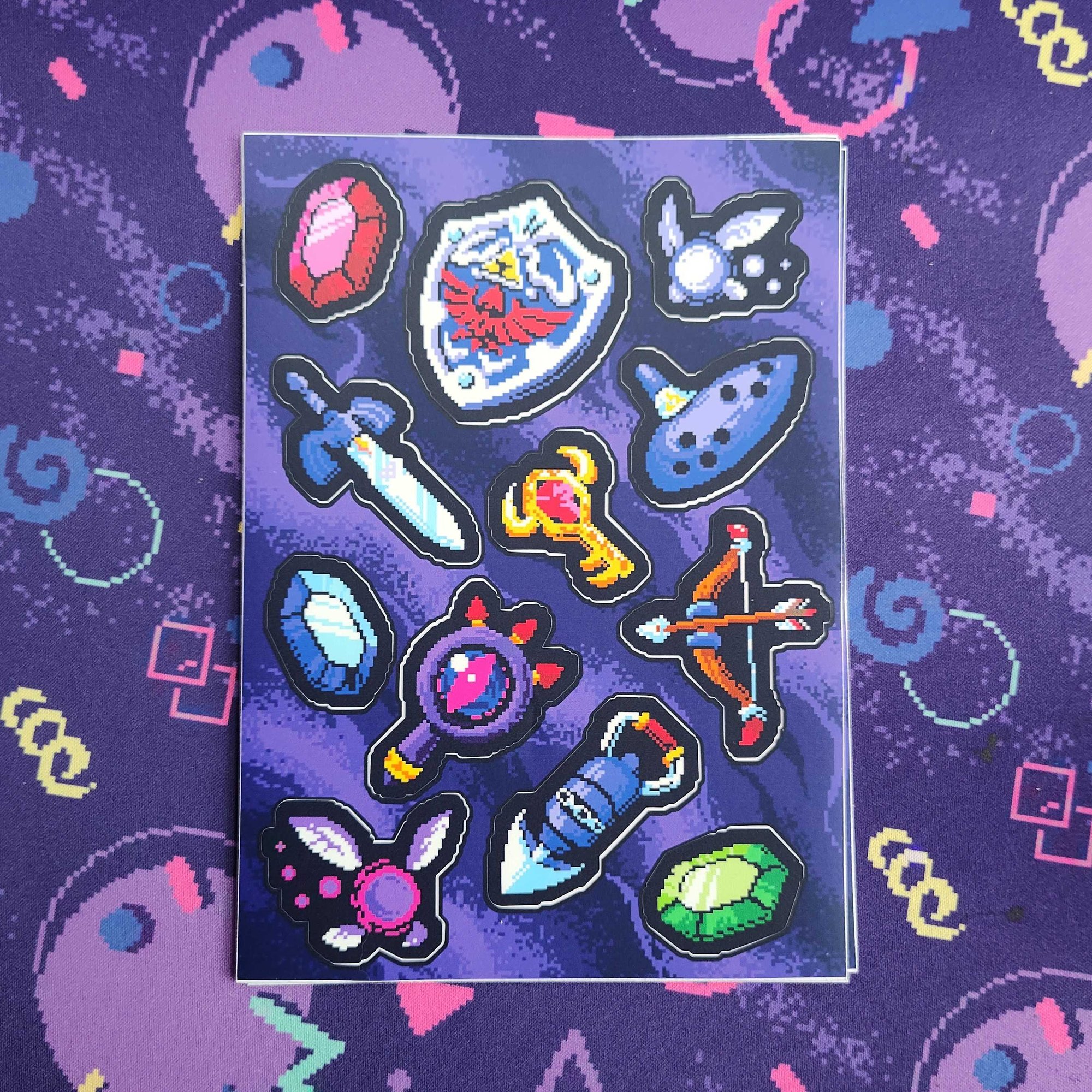 A 5x7in vinyl sticker sheet with 12 different items and such that could aid a hero in taking down the ultimate evil