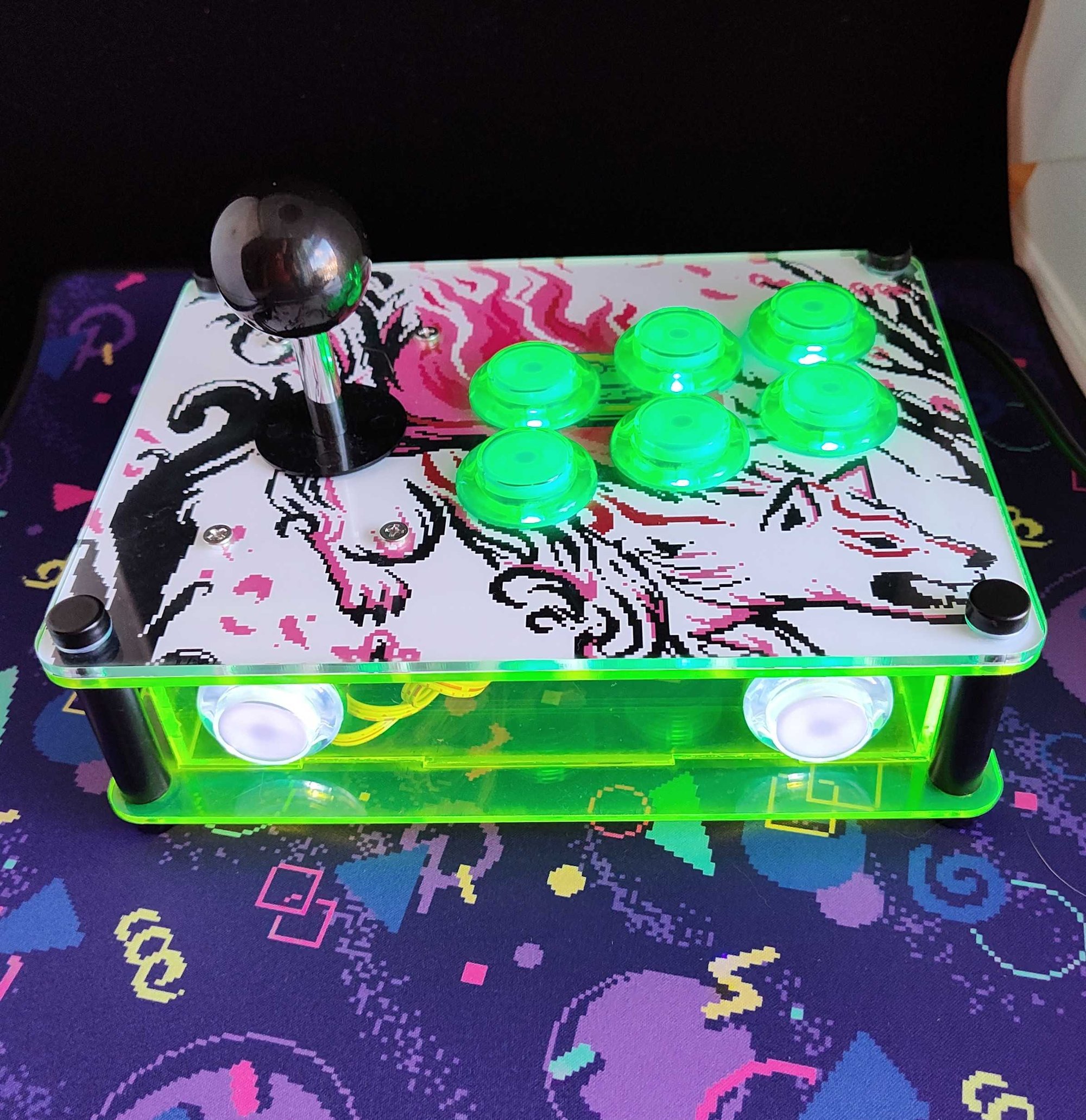 Hand-made and custom built start to finish, these PC-Compatible arcade sticks are fully working and clicky for the tactile players. Each stick is cut out of acrylic with a laser cut and assembled by Astra personally.