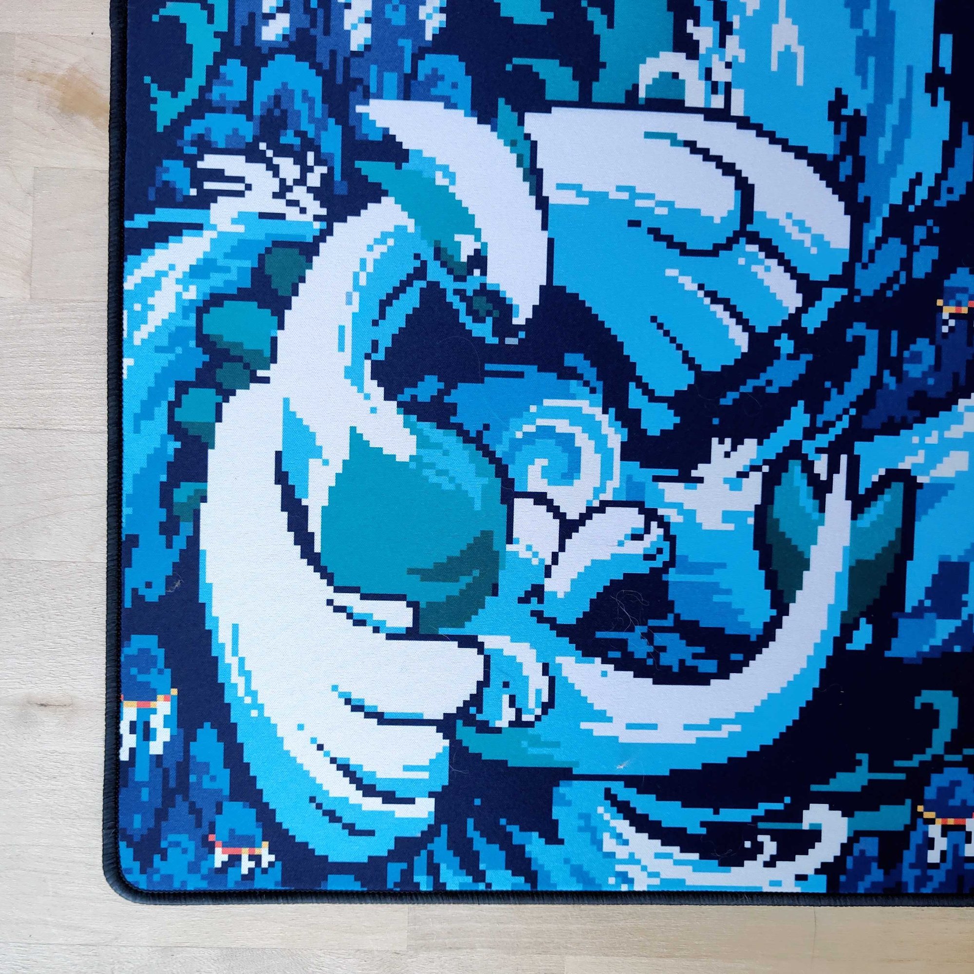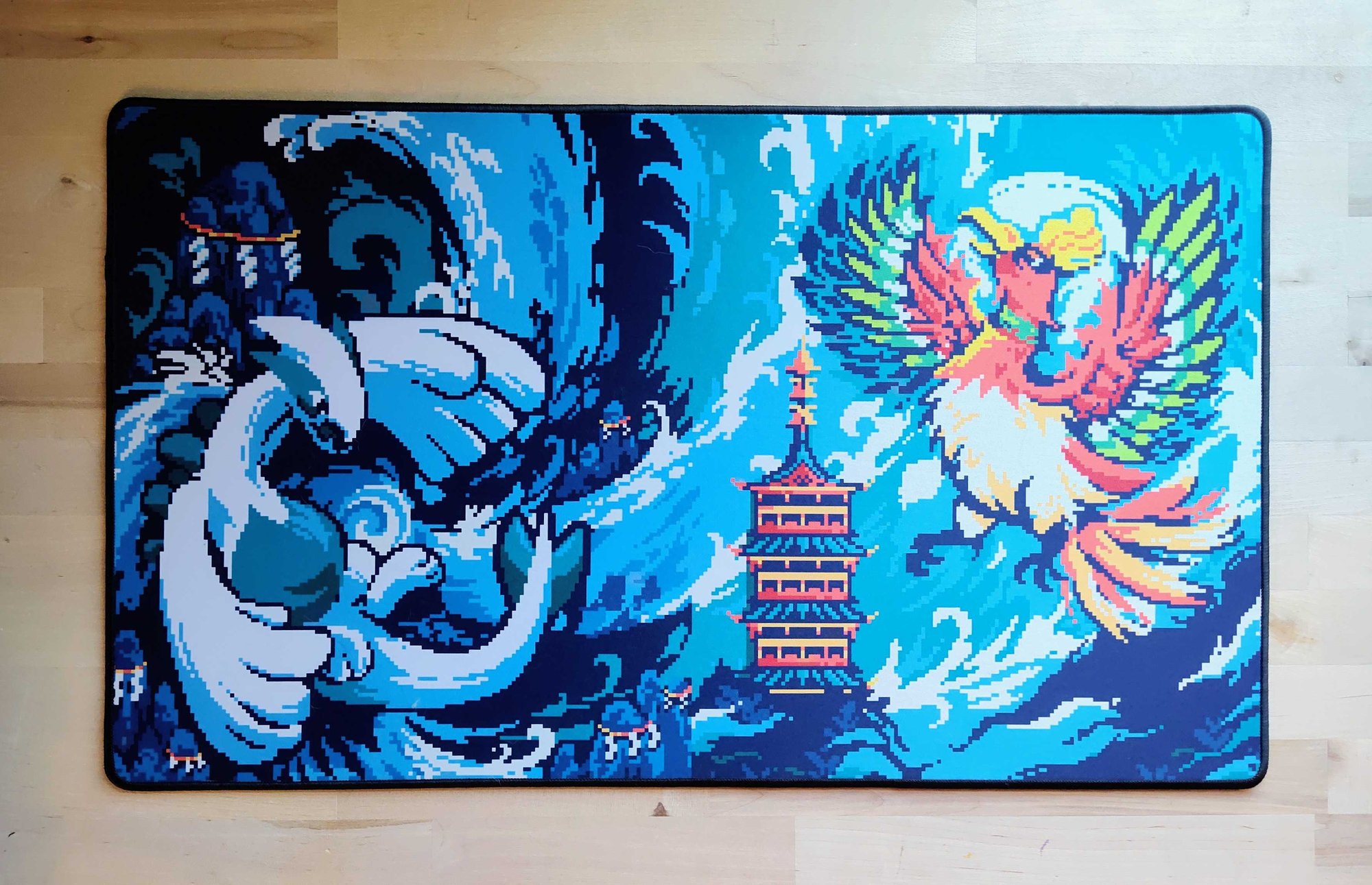 Playmats measure 24x14in and feature stitched black edging and rubber backing to prevent slippage.